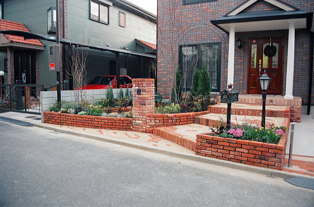 道行く人も楽しめる赤い古レンガのアプローチに癒しのガーデニング。