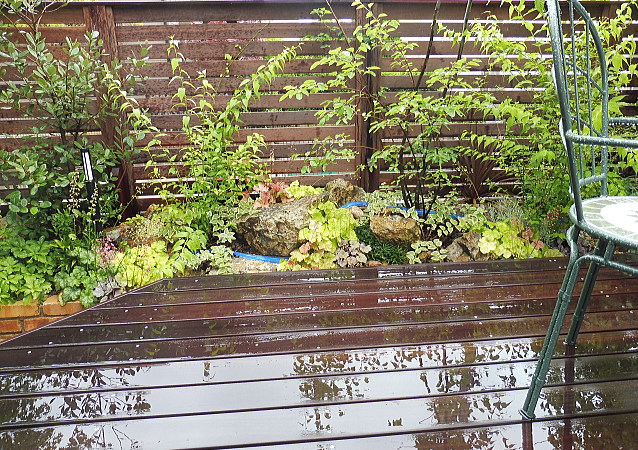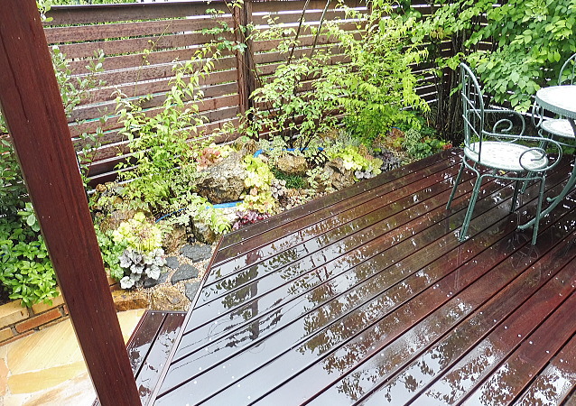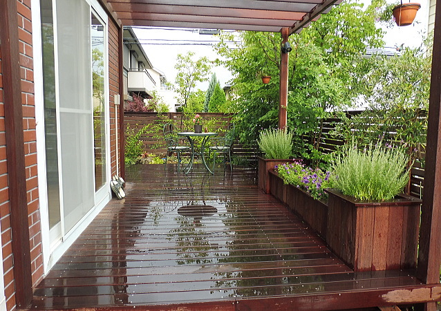 ウリン材のプランターにウッドデッキお庭の緑と、プランターの華やかな草花が、