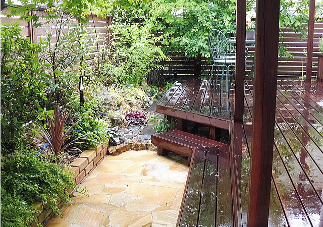 大阪市 鶴見 造園リフォーム施工例:古レンガのテラスの庭園
