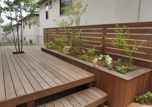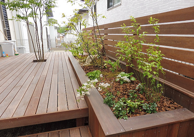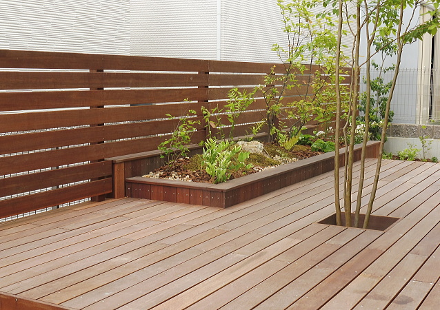 ウッドデッキの中に優しい樹形のヒメシャラの木