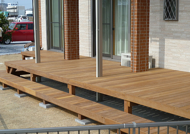 ウリン材でつくるウッドデッキの、大きめな階段は、開放感と、豪華さが感じられます。