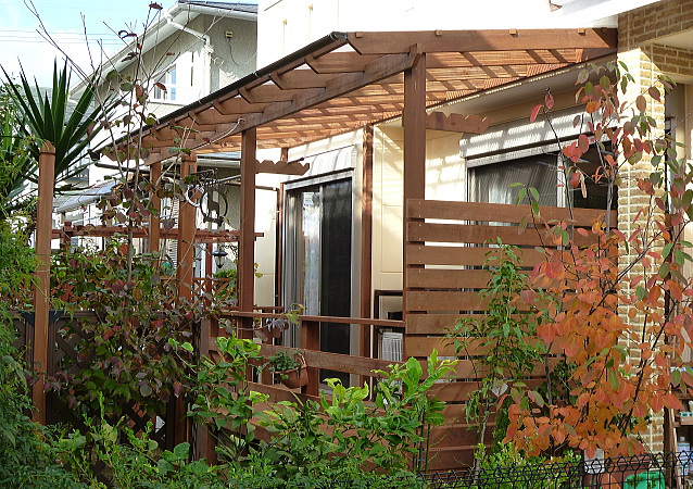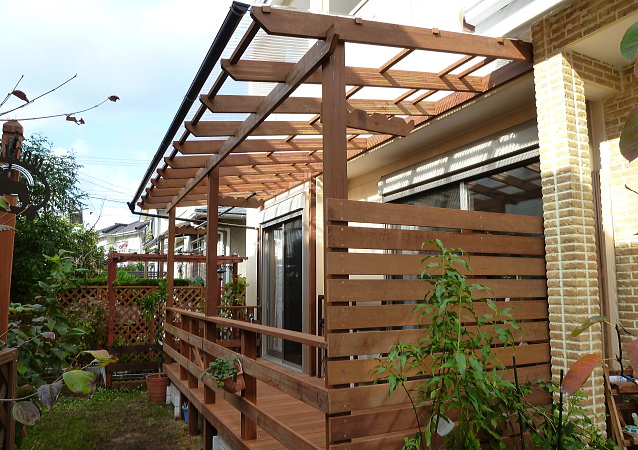 ウリン材の屋根付きパーゴラ。波板屋根付きです。