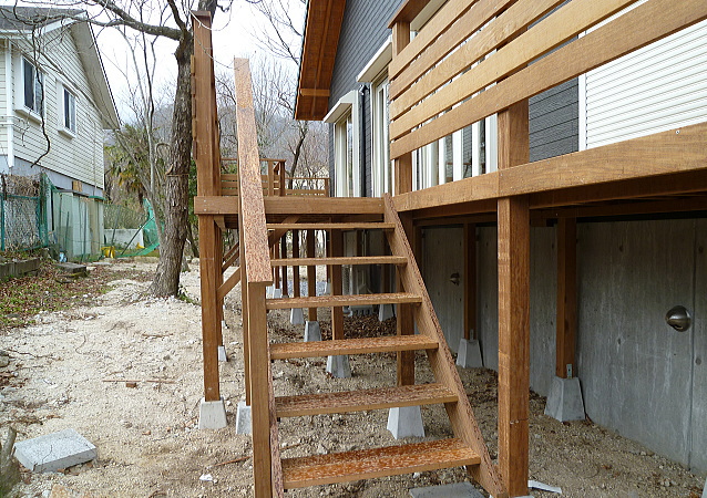 | イペ材で大形の階段 あいにく小雨が降ってきました。 |