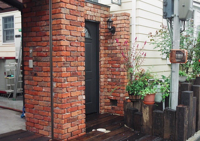 赤い古レンガ調のタイルと枕木の土間でその雰囲気をだしたガーデニング施工例