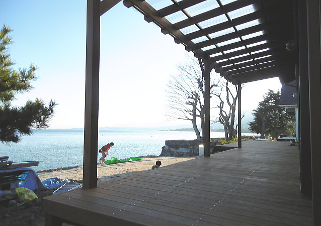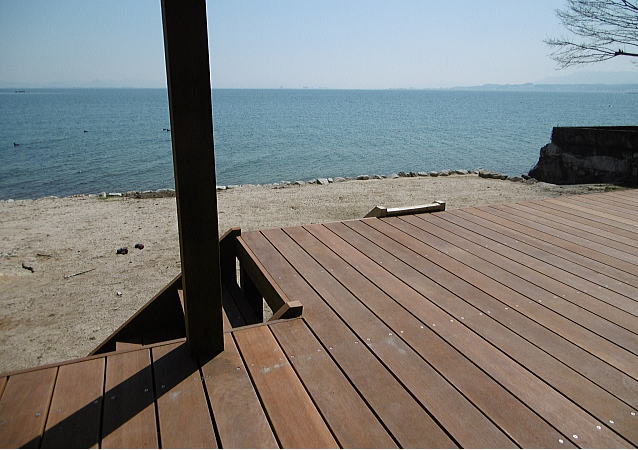 琵琶湖湖畔のウッドデッキ
