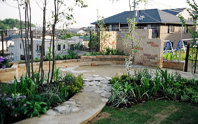 大阪 造園リフォーム施工例:古レンガのテラスの庭園