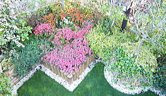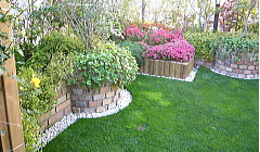 芝生の広い空間を取り囲むようにアンティークレンガと寄せ植えで