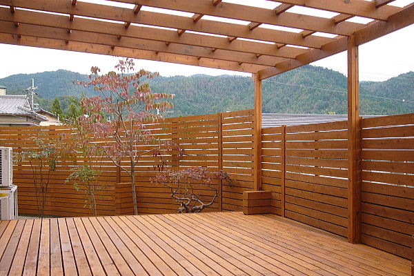| 目隠し板塀で、隣地の建物を隠しパーゴラとの間から大自然の山々が |