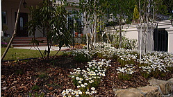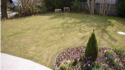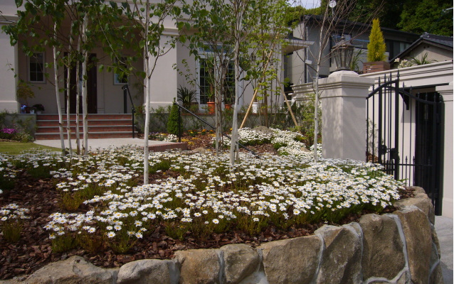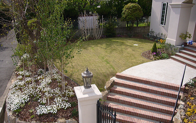 。庭全景 ノースポールの白と芝生の緑 庭つくりには、色彩のバランスが大事です。