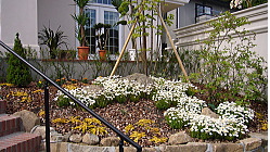 アプローチ横の空間にリキマキシアとノースポールの寄植え