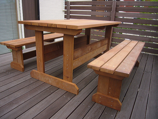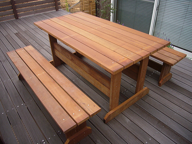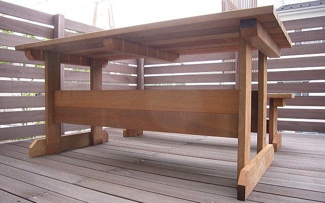 ウリン材で作ったテーブル、ベンチは、高耐久で、高級感あふれるオリジナルなものとなります。