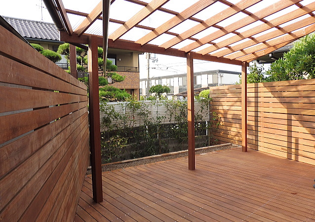 お客様の ご自宅の裏庭が変形なのですが その敷地ほとんどいっぱいに ウッドデッキとパーゴラを