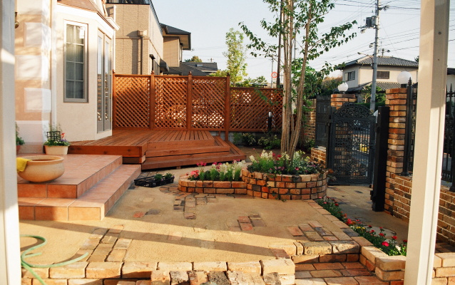 大阪 造園リフォーム施工例:古レンガのテラスの庭園