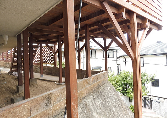 高台の高床ウッドデッキ 足元は 頑丈に 頑丈に